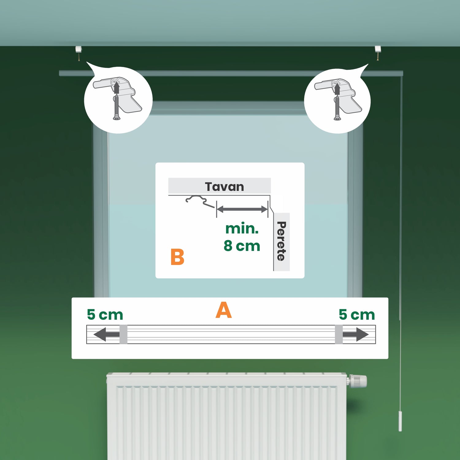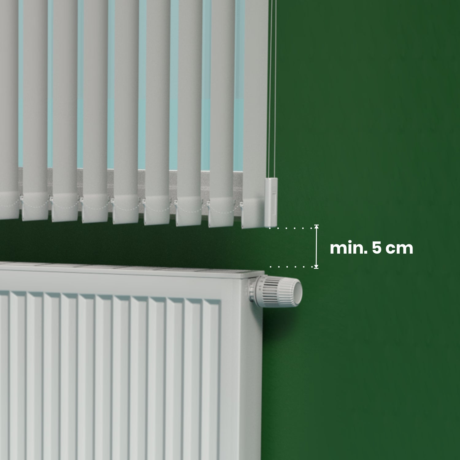 Recomandăm ca jaluzeaua să se oprească cu minim 5 cm deasupra caloriferului, pentru ca lamelele să nu îl atingă și să funcționeze corect.